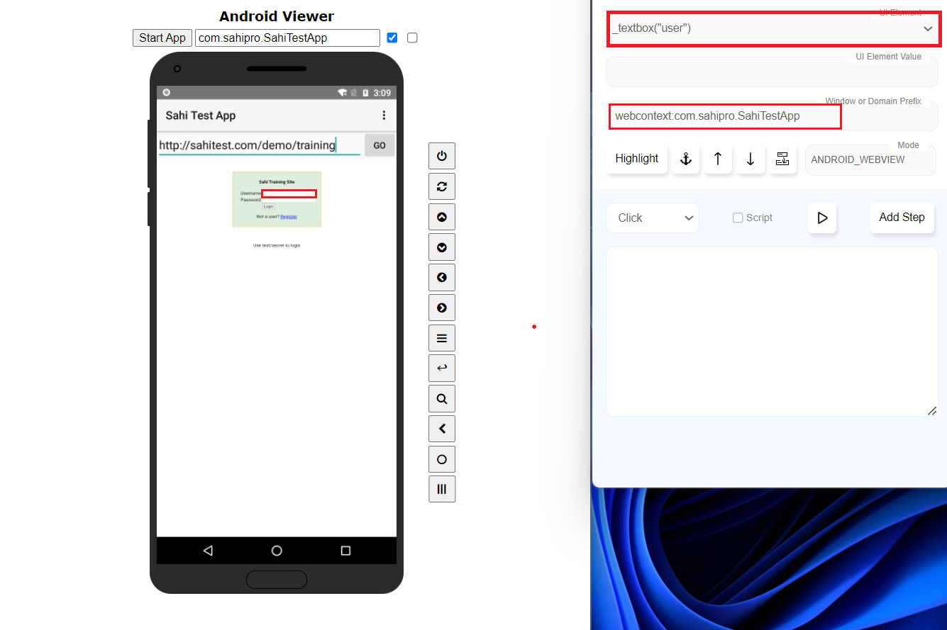 SpecifyApplication Package Name:com.sahipro.SahiTestApp - Click on Launch to launch the Application.