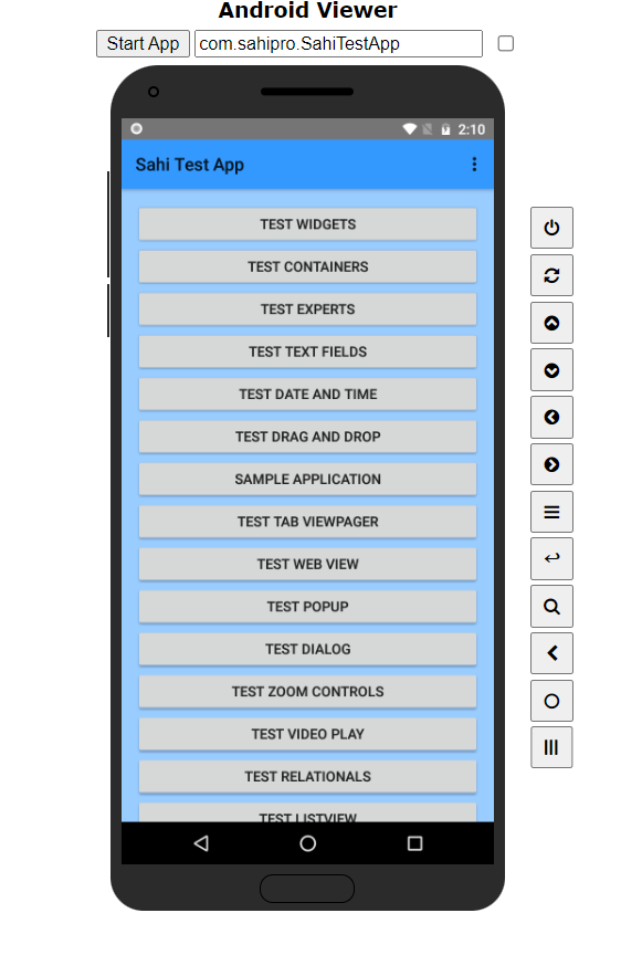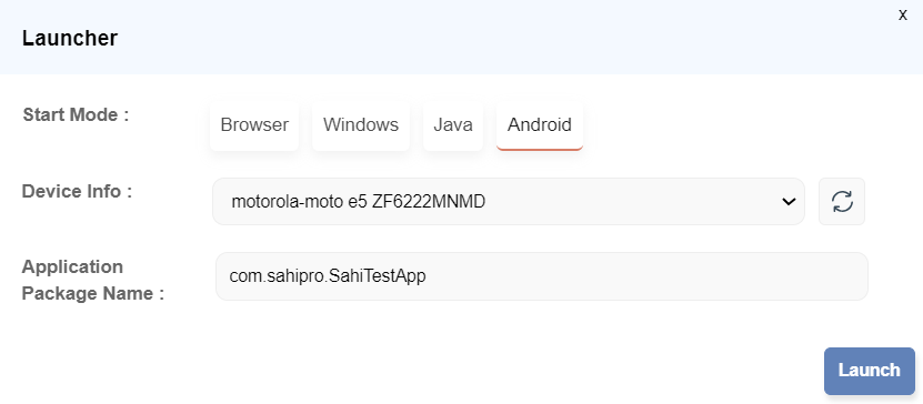 SpecifyApplication Package Name:com.sahipro.SahiTestApp - Click on Launch to launch the Application.