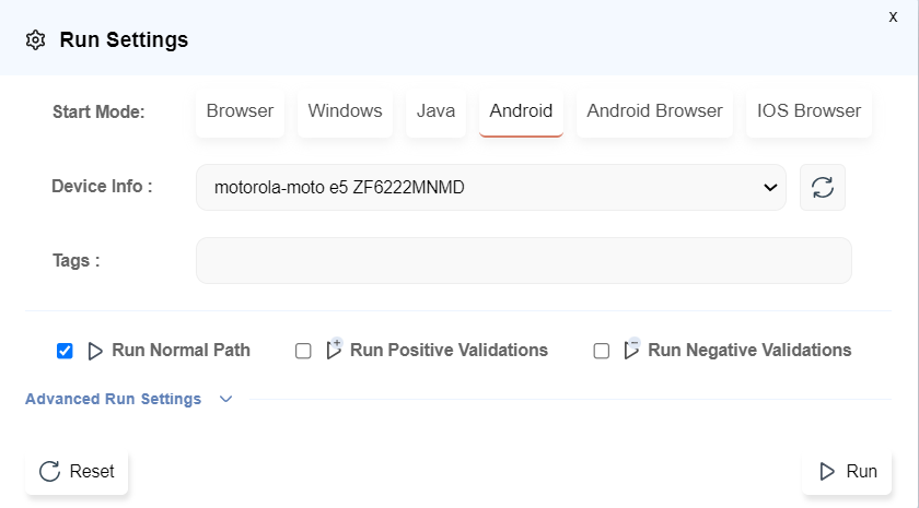Run Settingsdialog opens. Select the ModeAndroidand clickRUN.