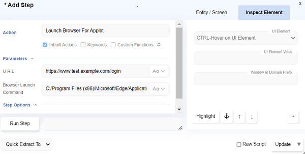 Launch Browser For Appletfrom the Add Step dialog and launch the browser for applet. - You can now start automating. As with normal Sahi Pro Flowcharts, you can use CTRL-Hover to identify various elements on the applet.