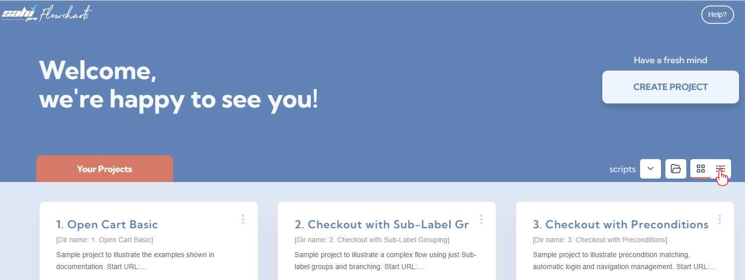 3. The User interface opens in your default browser, displaying the welcome screen or the project page. By default grid view is selected, to change into list view click on list view icon.