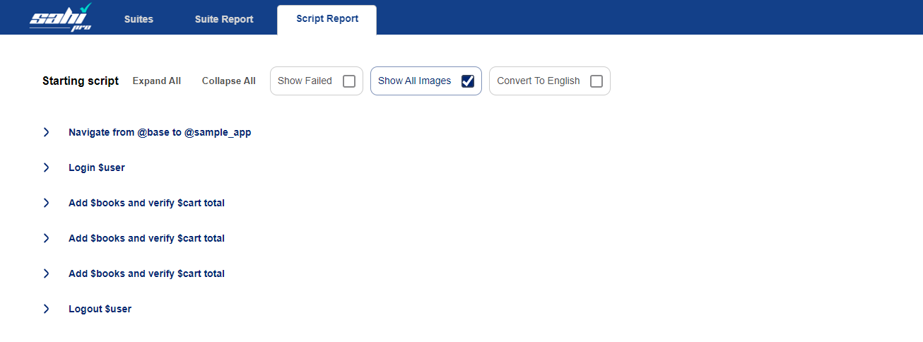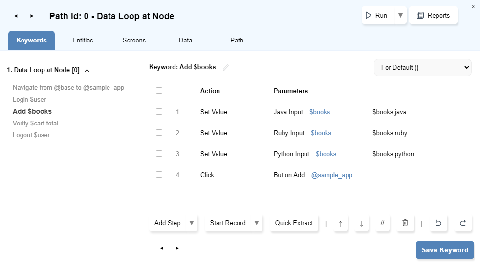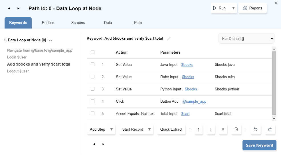 Reportsbutton/option. - The detailed report shows the path execution with the used dataset row details. The keywords