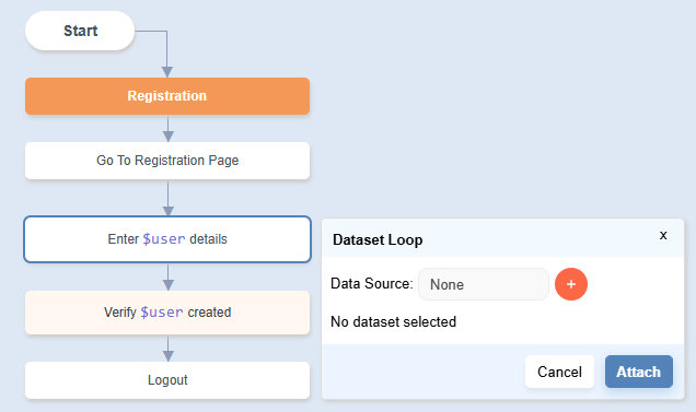 The start and end boundaries can be defined for the dataset attached to a node.The Keywords in the Nodes inside the start and end boundaries will be run in a loop over all rows of the dataset.
