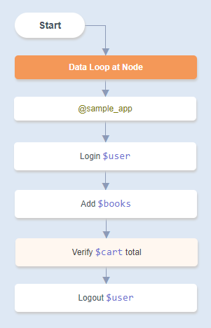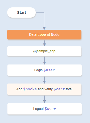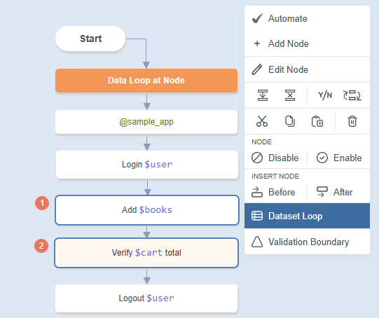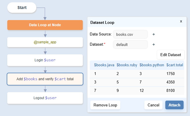 Add $booksnode act as starting point of the dataset loop andVerify $cart totalnode act as ending point of the dataset loop.