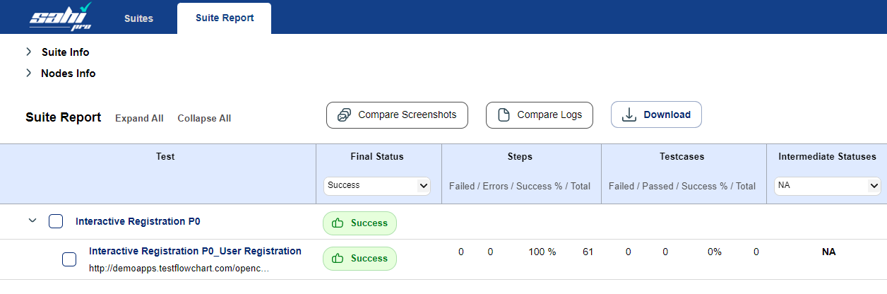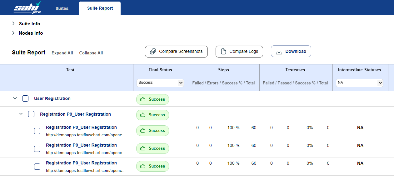 Reportsbutton/option either from theAutomatedialog or from the flowcharts page. - The detailed report shows the execution with the used dataset row details.