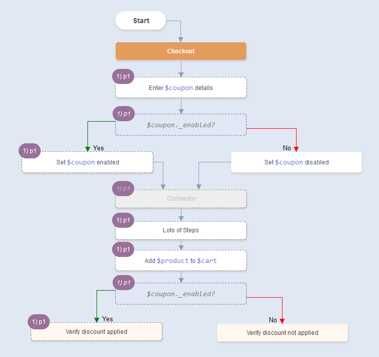 In the example below,$coupon._enabled ensures that Verify discount applied is executed with Set $coupon enabled and NOT with Set $coupon disabled