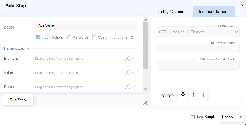 The Add Step dialog has an Inspect Element tab where we can identify and interact with the application.