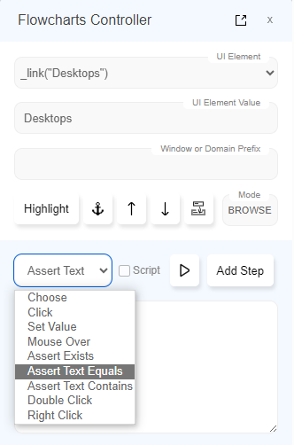 - Click the Assert button to add steps for asserting the value of selected properties in the opened Keyword in Automate Dialog on Flowcharts UI