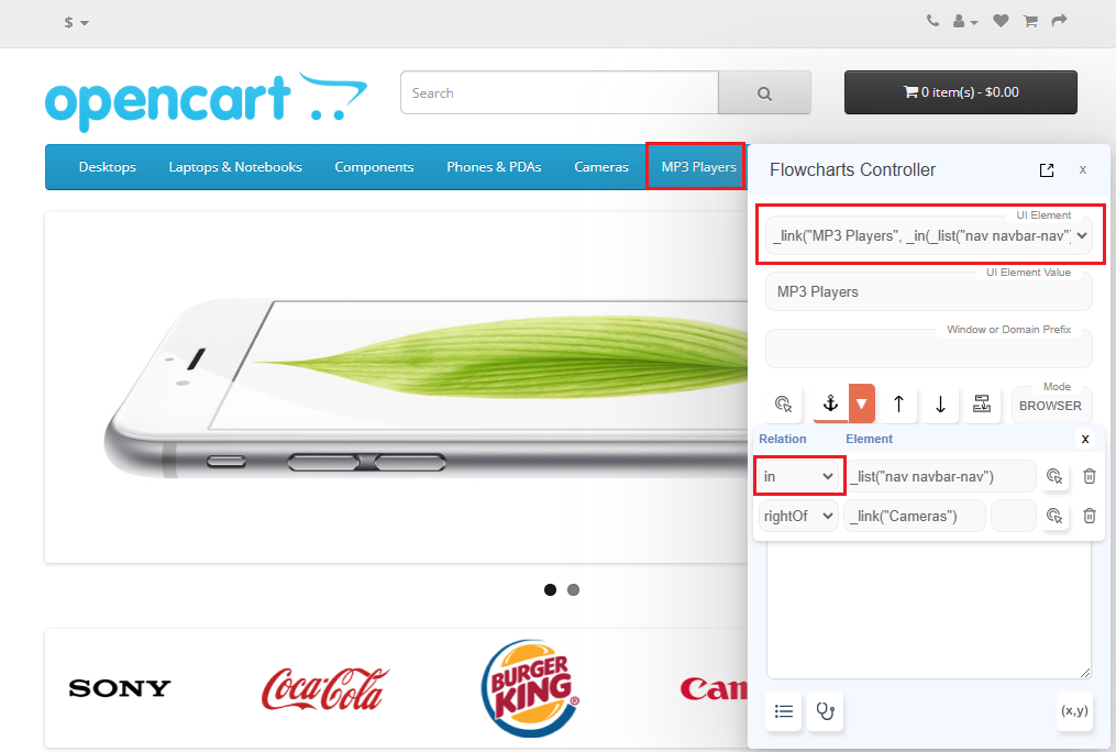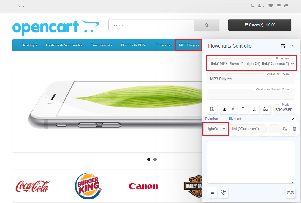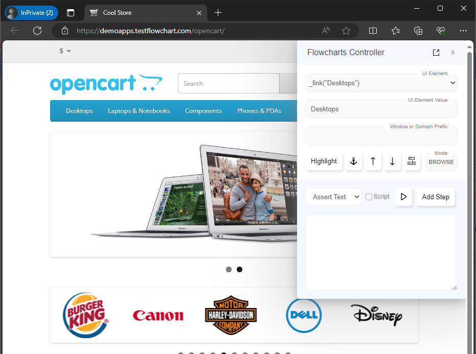 To work with the application and identify elements, we can keep the application window and Flowcharts window side by side. However since the Flowcharts window is big, this can be inconvenient - especially on Mac, since focus is needed to interact with the browser.