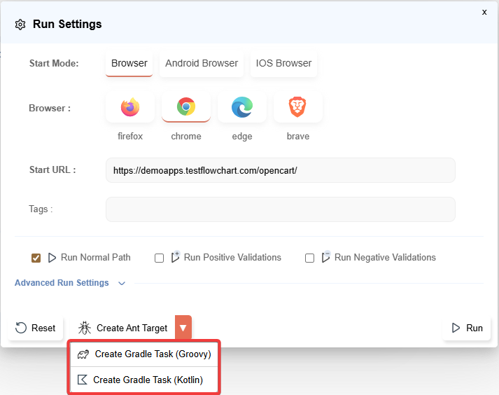 One can now use theRun Settings dialog to generate the Gradle script automatically. Refer Run Settings for details on the UI.