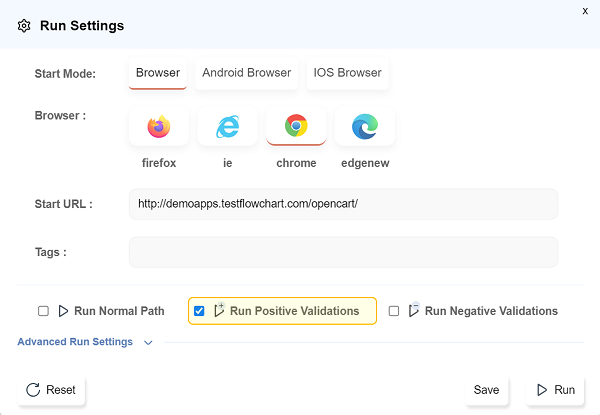 Run Settingsdialog opens. Select the checkboxRun Positive validationsonly and deselect others.- Click on