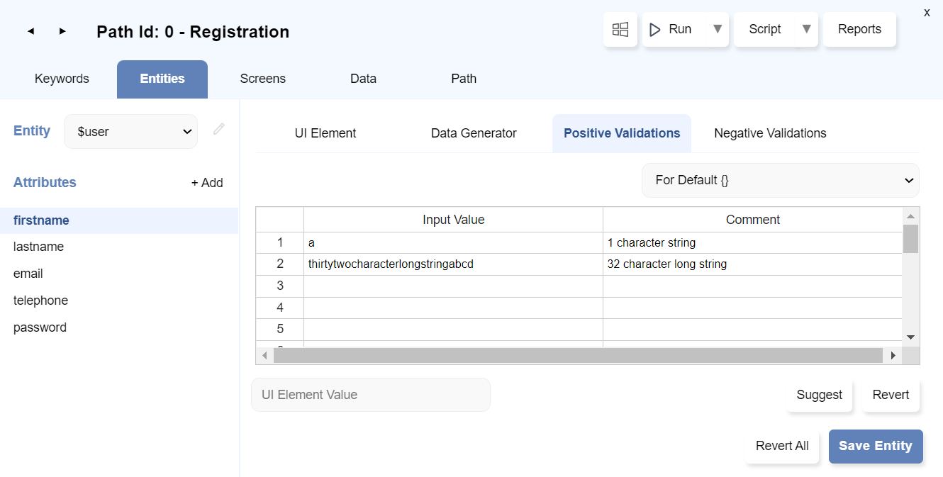 Positive Validationstab and select Entity:$userand Attributefirstname. - Type the Input values and comments to define it.