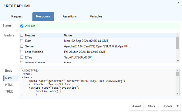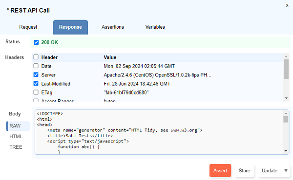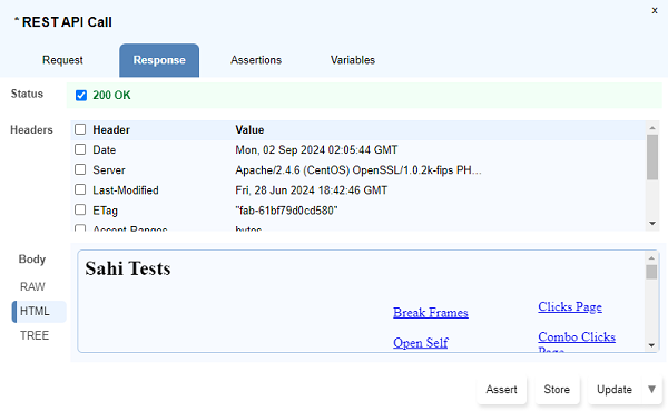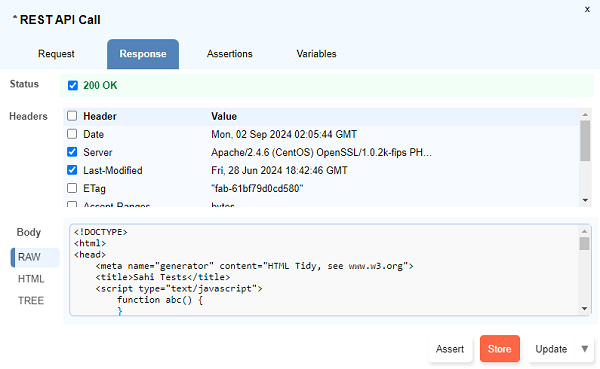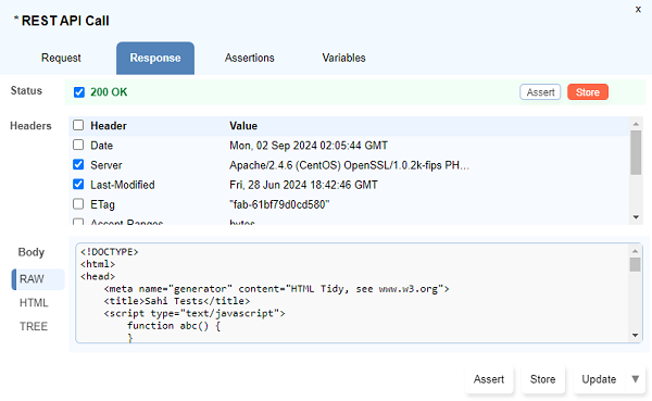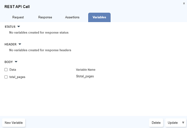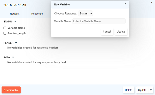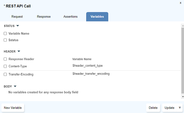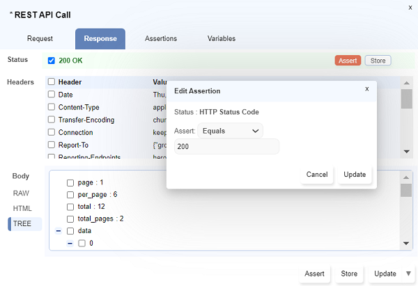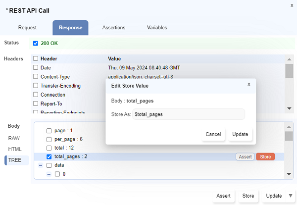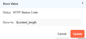 Store Valuedialog opens up. Type the variable name preceding with a$symbol and click onUpdate. - Multiple response values can be stored simultaneously using the checkboxes to select and then click on
