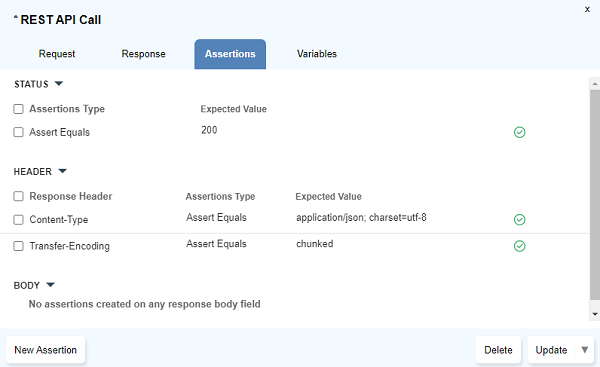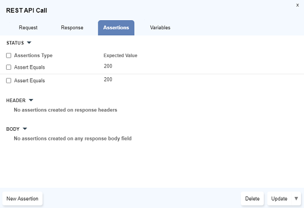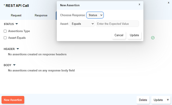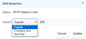 Add Assertiondialog opens up. Select the relevant assertion type and click onUpdate - Multiple assertions can be set simultaneously using the checkboxes to select and then click on