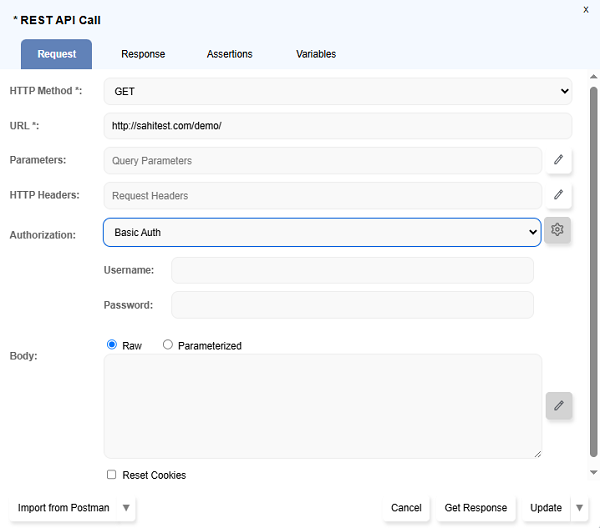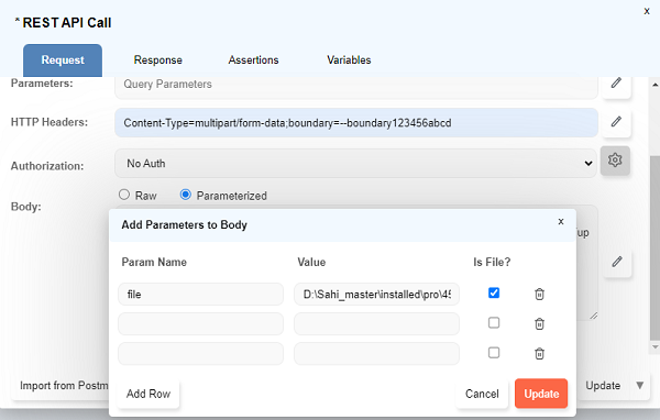 Parameterizedradio button forBodyfield and specify the file path or any other body parameters if required. - Click on the