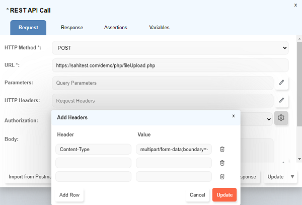 HTTP Methodcombo box. - Specify the file upload