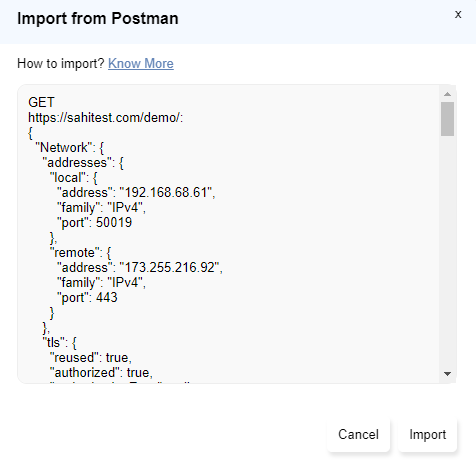 Import from Postmandialog and click onImport request from HARbutton. - Paste the request section of the response to be validated from HAR logs and click on