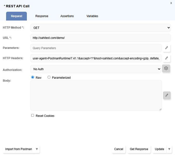 REST APIdialog with the options to callGET,POST,PUT,DELETE,PATCH - Choose relevant call, ex. GET and complete the fields like
