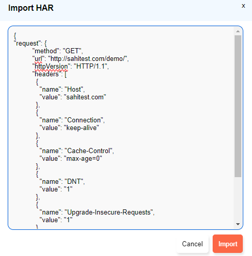 { "request": { "method": "GET", "url": "http://sahitest.com/demo/", "httpVersion": "HTTP/1.1", "headers": [ { "name": "Host", "value": "sahitest.com" }, { "name": "Connection", "value": "keep-alive" }, { "name": "Cache-Control", "value": "max-age=0" }, { "name": "DNT", "value": "1" }, { "name": "Upgrade-Insecure-Requests", "value": "1" }, ], "queryString": [], "cookies": [], "headersSize": 585, "bodySize": 0 } }
