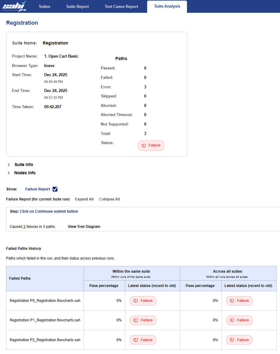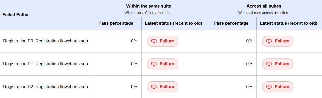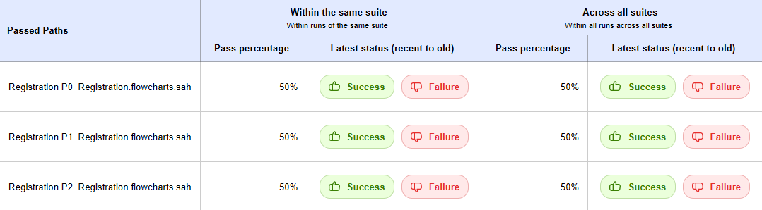 The history of past run results for the failed paths along with their pass percentage are showcased in this table. It helps to keep track of failed paths. The history tables are categorized into 2 as:Within the same suite: paths executed from the same flowchart/project is considered in this section.Across all suites: This section covers the history of path whenever it is executed irrespective of the flowchart/project from which it is executed.
