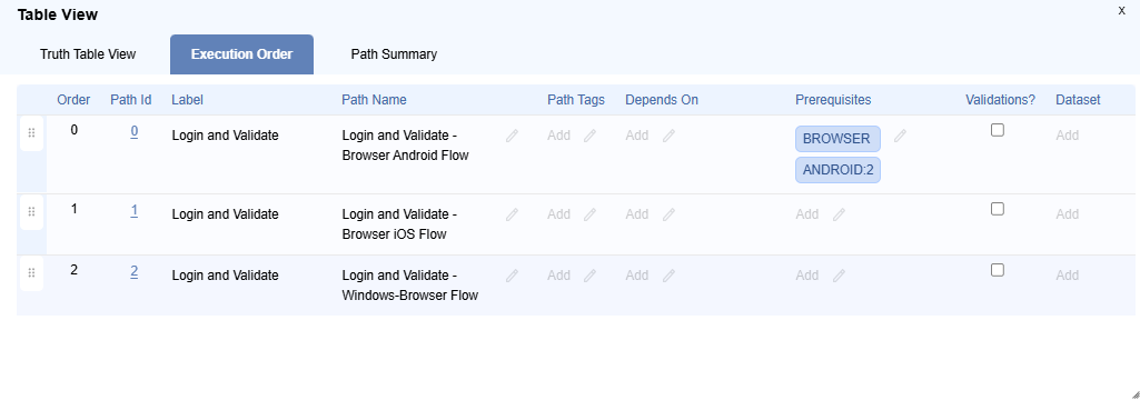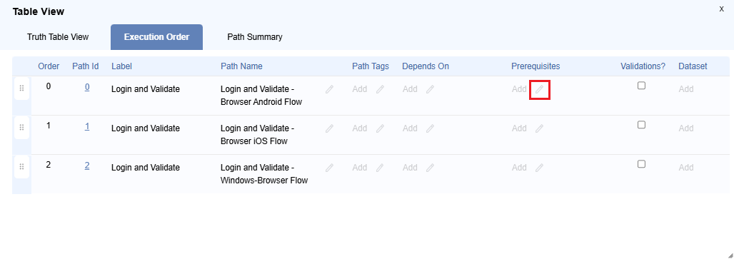 Table Viewdialog, navigate to theTruth Table VieworExecution Order, then click onPrerequisiteslocated near theLogin and Validate - Browser Android Flow.