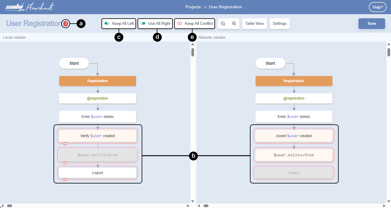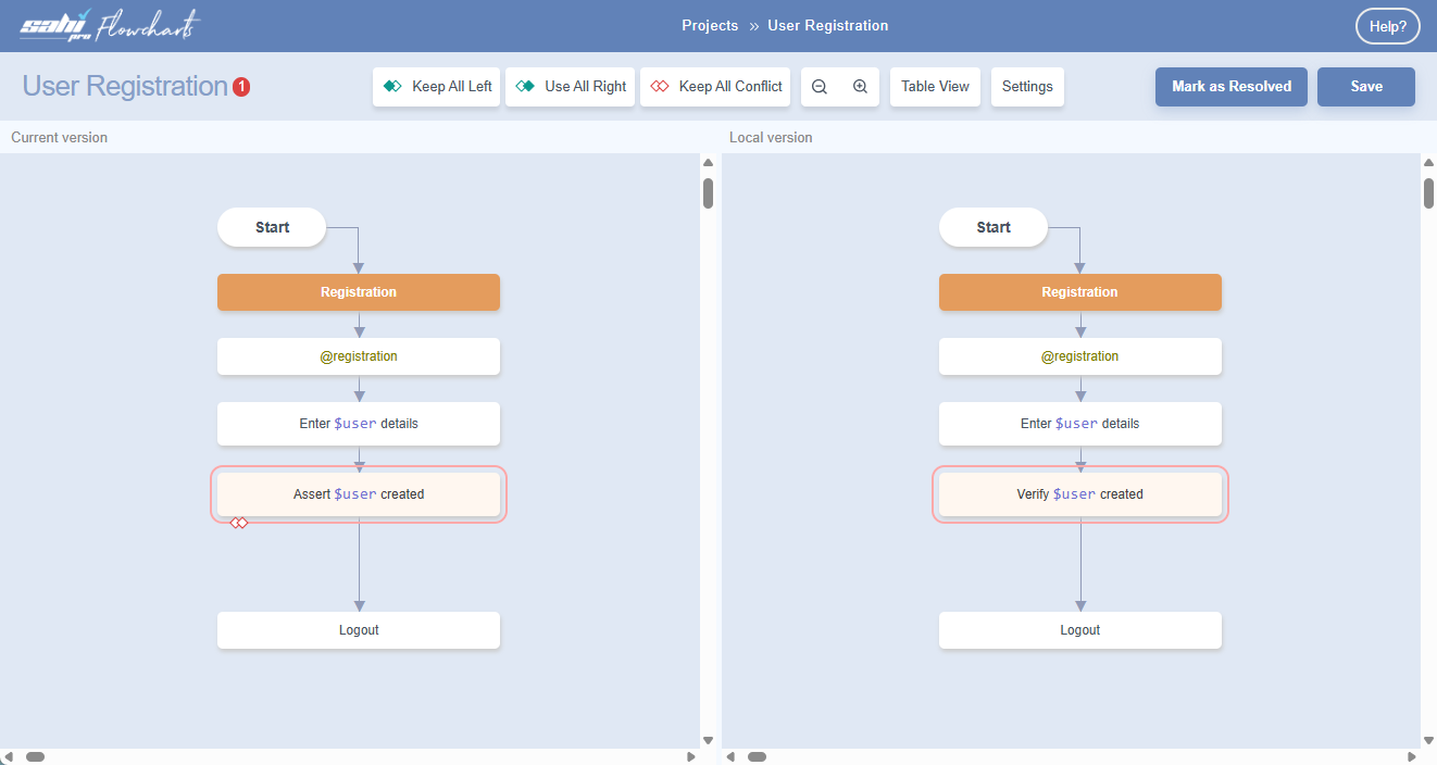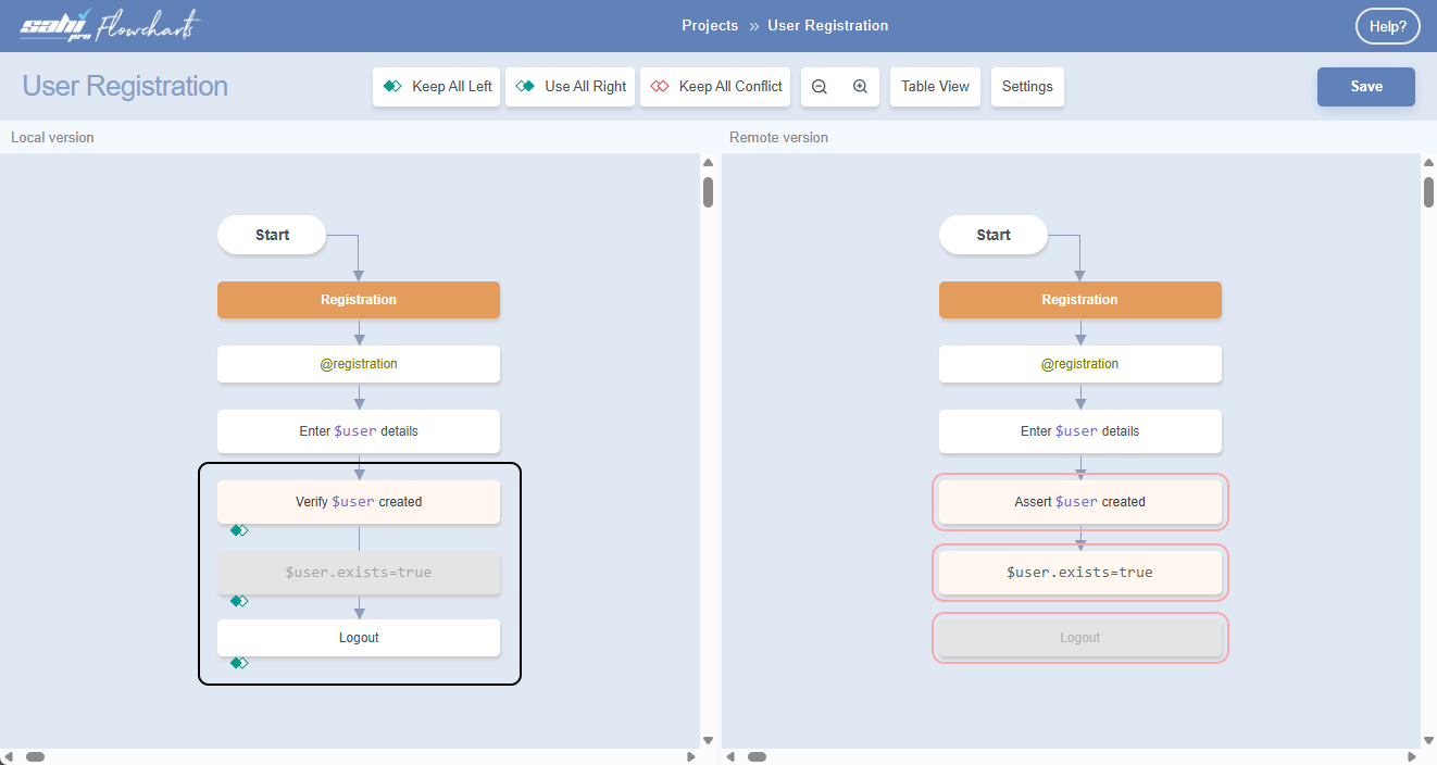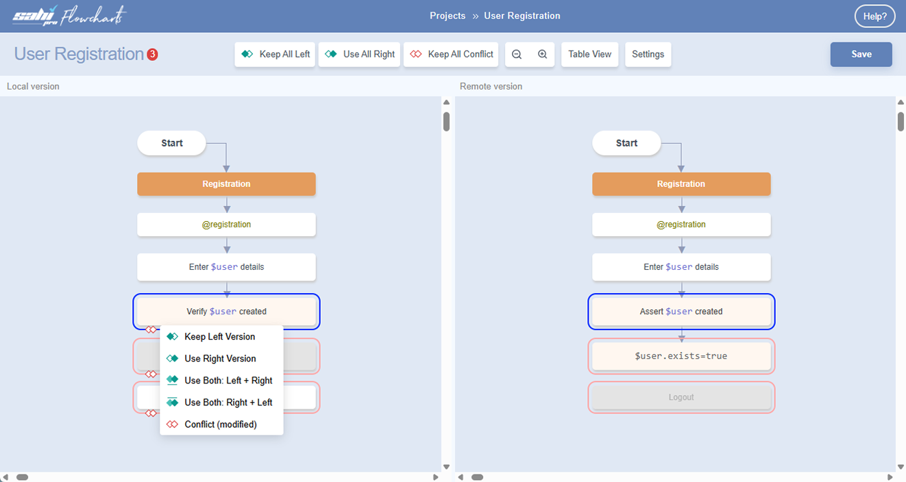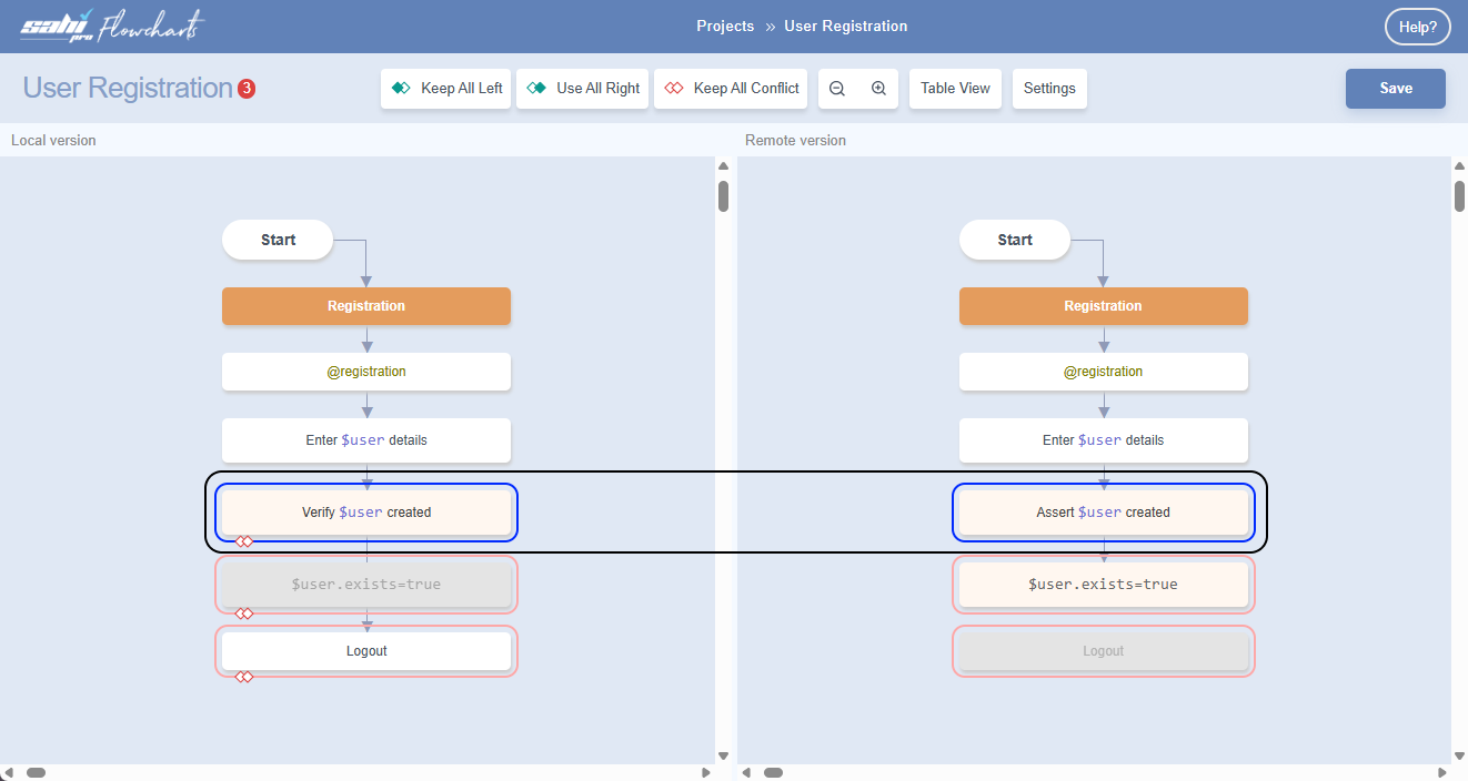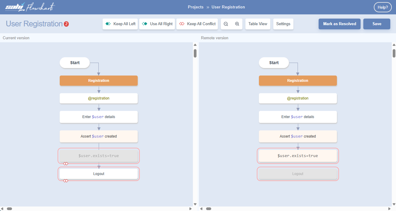 Below we have examples to resolve merge conflicts at the Flowchart level: