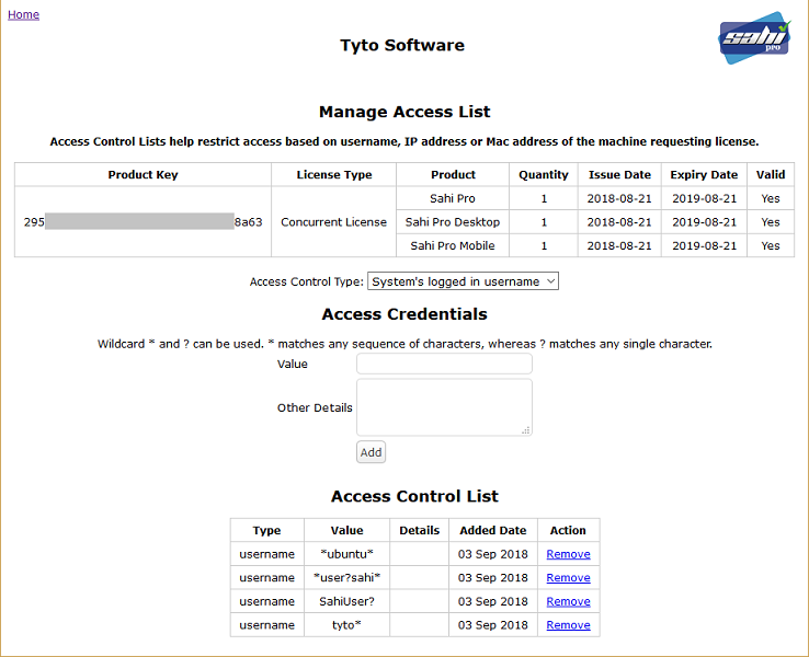 Access Control Lists help restrict access based on username, IP address or Mac address of the machine requesting license.- Sahi Pro users who are added in the