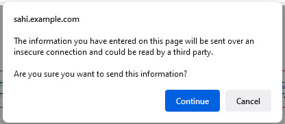 - Firefox displays below warning for sending information from a secure to an insecure connection. This warning is now disabled in Sahi.