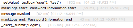_maskLogs tells Sahi not to display further steps in the playback logs and in the Controller. This is used when sensitive information like password may be entered via script, but we do not want it stored/displayed anywhere Toggled by _unmaskLogs.