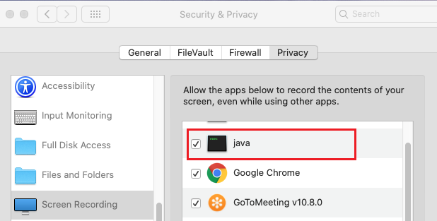 - Select the tickbox next to Java to allow it to record your screen.