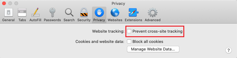 - Untick 'Prevent cross-site tracking' next to Website tracking.