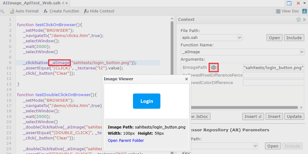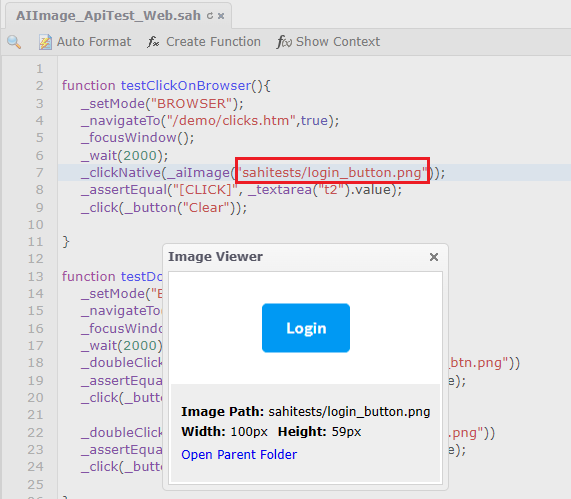 If any script is opened in editor and has _aiImage API used in it, the image which is passed as the imagePath argument can be viewed from the editor. There are two ways.- CTRL clicking the imagepath argument in script will open the image viewer.