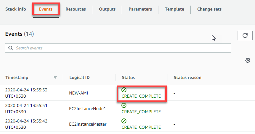 - Check the 'Events' tab to verfiy the stack creation is successful. After successful creation, wait for 10-15 mins for instance to be ready for use