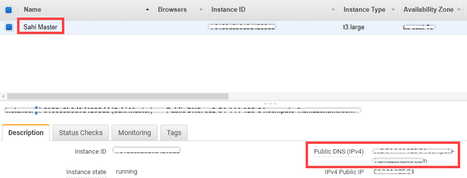 - Copy the 'Public DNS (IPv4)' from the 'Description' tab and paste it on 'Configure Nodes' in Sahi 'Playback Properties'