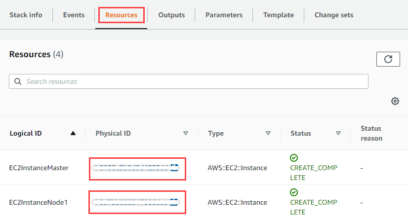 - Navigate to 'Resources' tab. Click on Physical ID for EC2InstanceMaster and it will take you to EC2 instances page with Master machine details