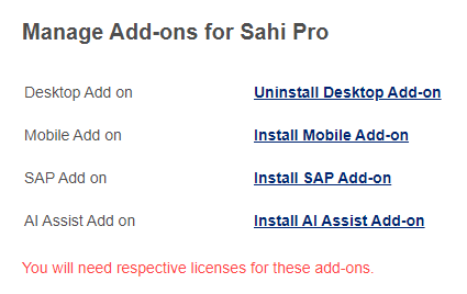 Sahi now allows user to install add-ons by simply selecting the desired add-on link. User will need respective licenses for these add-ons.- Open