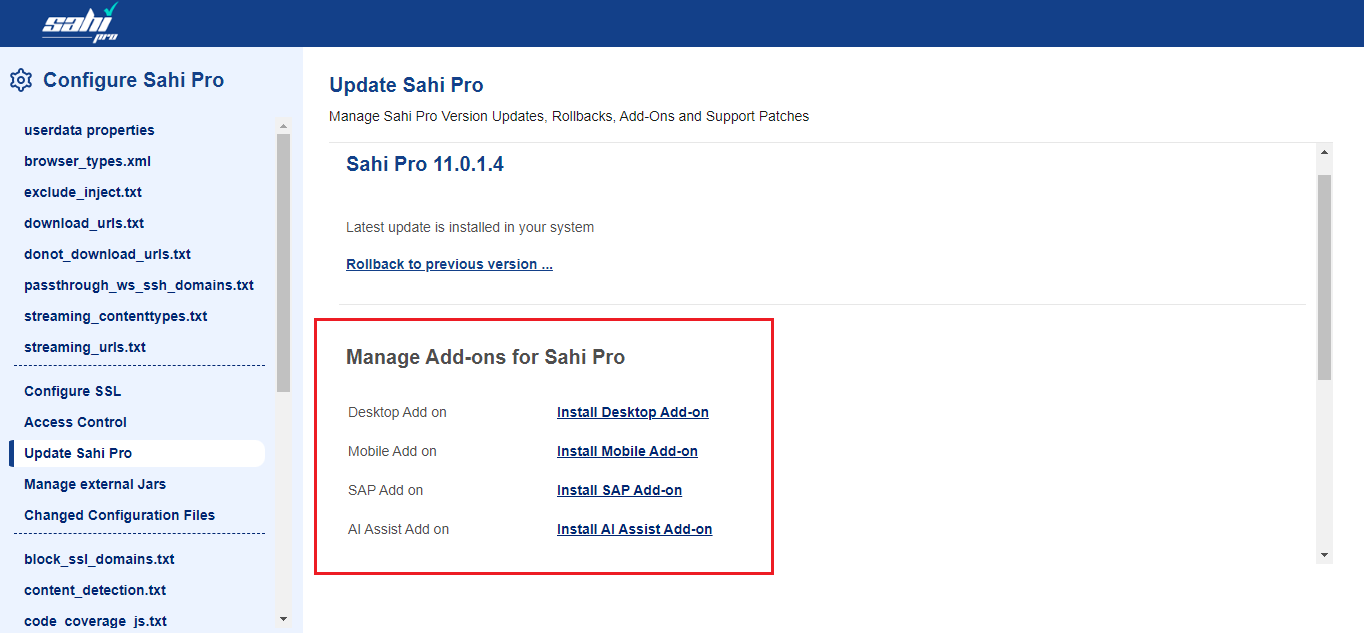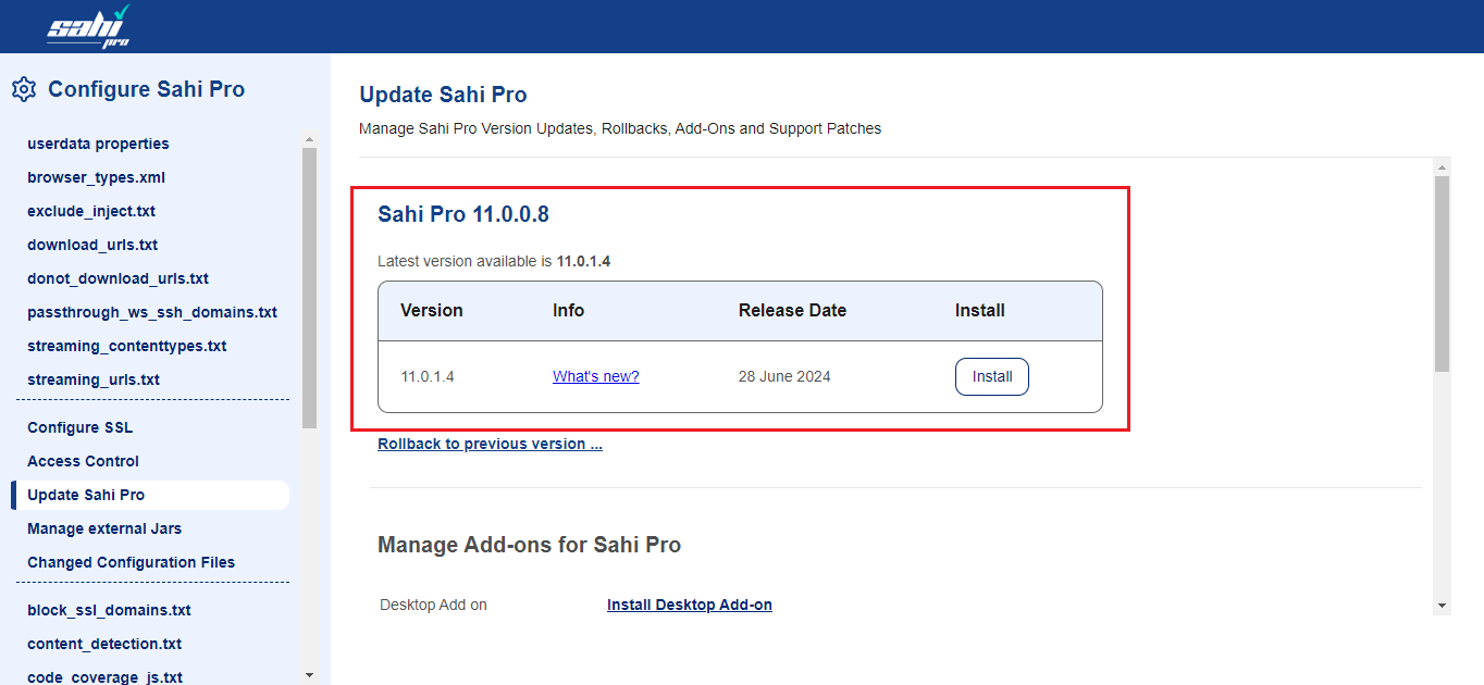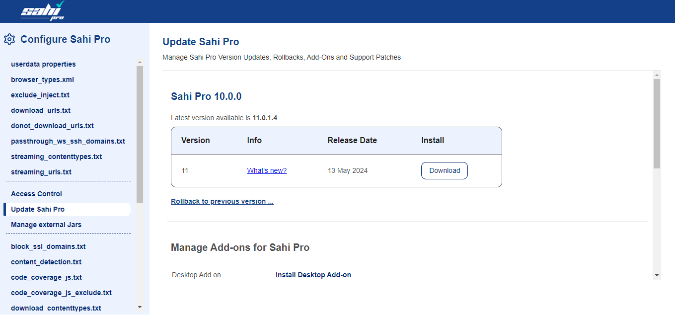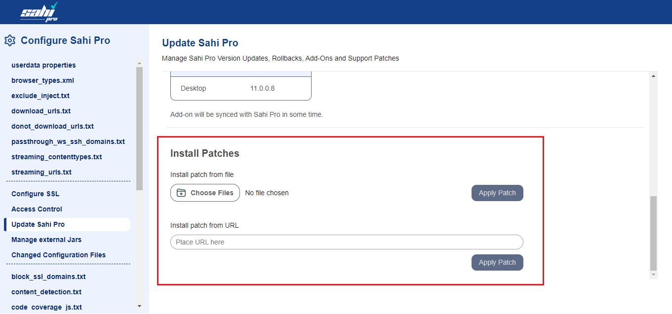 Manage Sahi Pro Version Updates, Rollbacks, Add-Ons and Support Patches