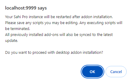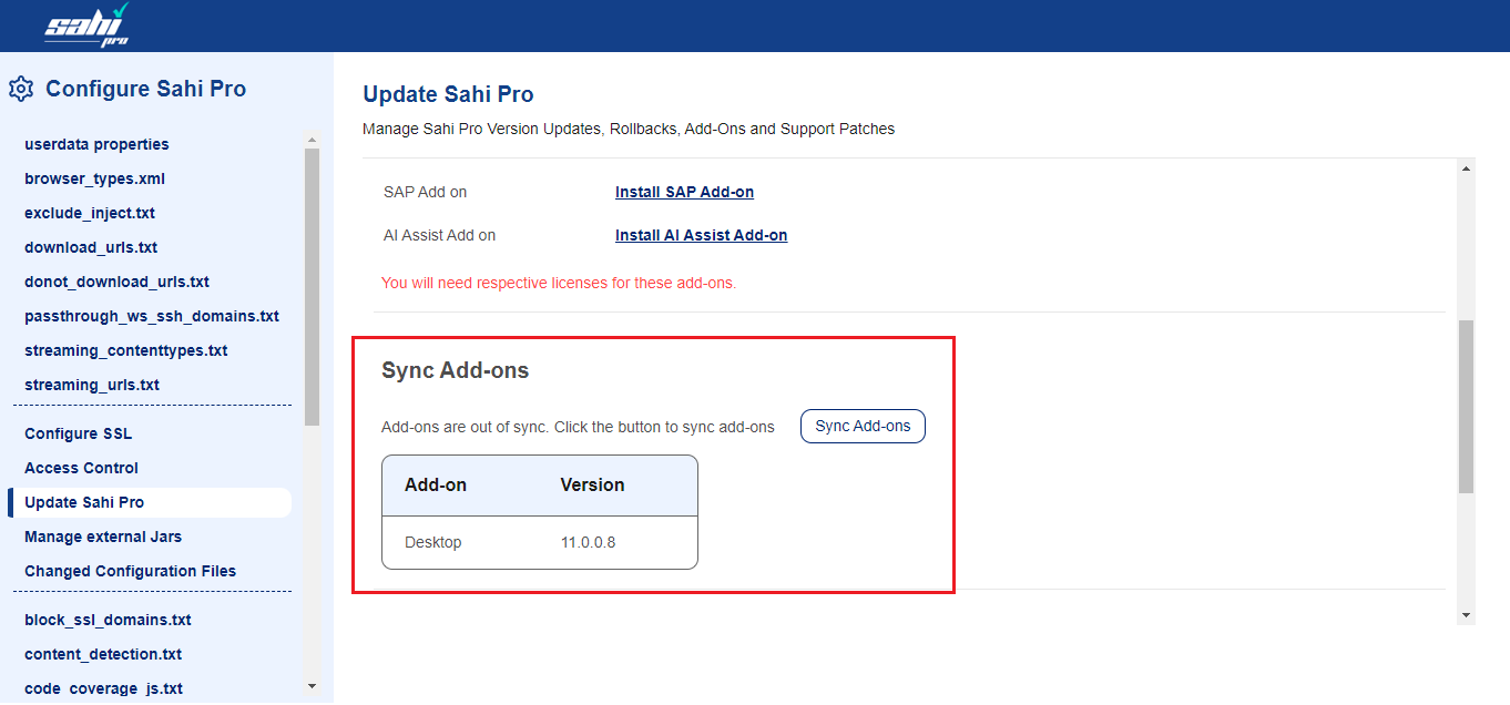Configurepage then Sahi Pro updates the add-ons to the latest version installed on the user's system. - If add-ons are installed from the jar file and the user has updated Sahi Pro to the higher version then user needs to sync add-ons from the
