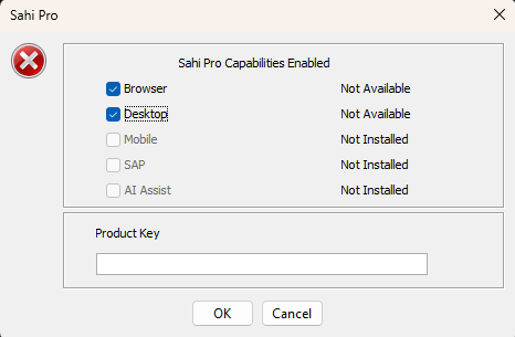 infoSahi Pro Browser capability can be disabled by unchecking the Browser checkbox. One needs to add Product Key based on Sahi Pro capabilities enabled.