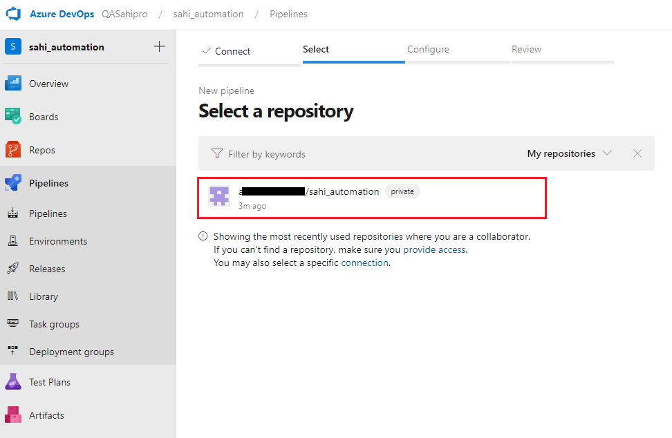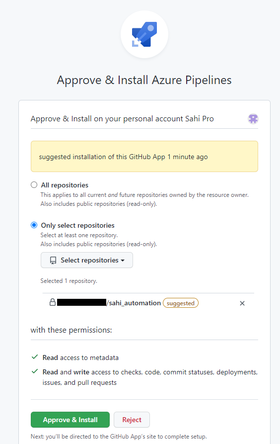- When you see the list of repositories, select your repository. You might be redirected to GitHub to install the Azure Pipelines app. If so, select Approve & install.