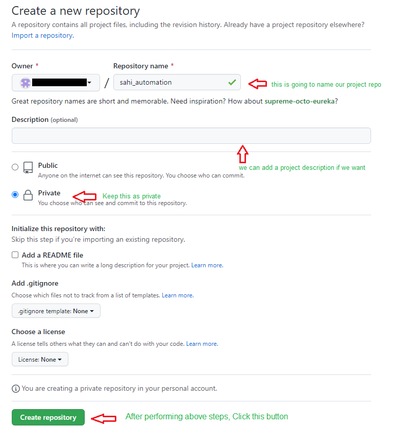 - After clicking new repository option, you will have to initialize some things like, naming our project, choosing the visibility etc. After performing these steps click Create Repository button.