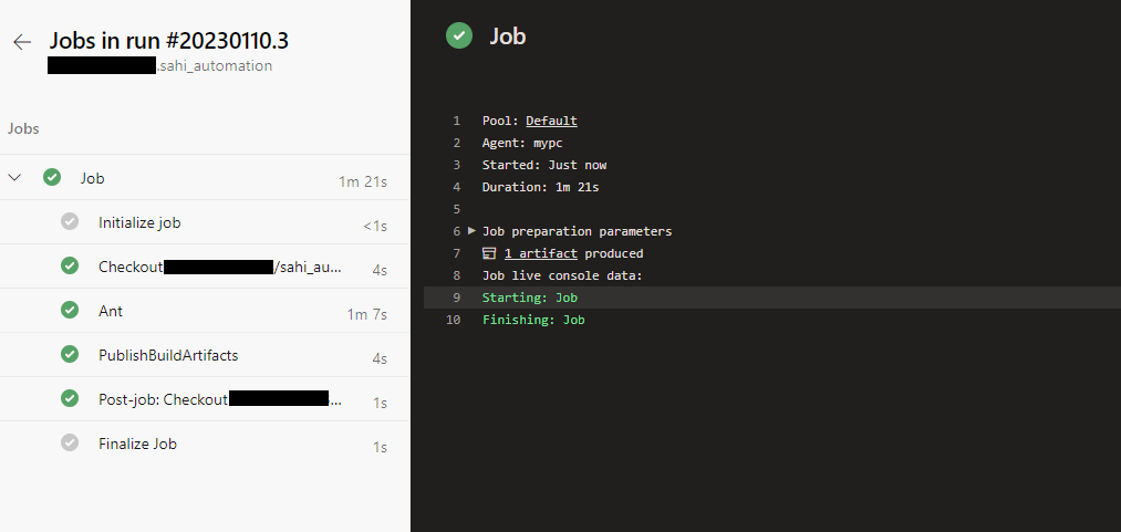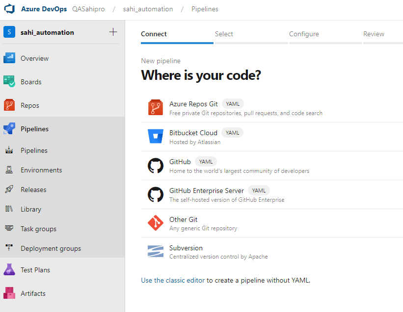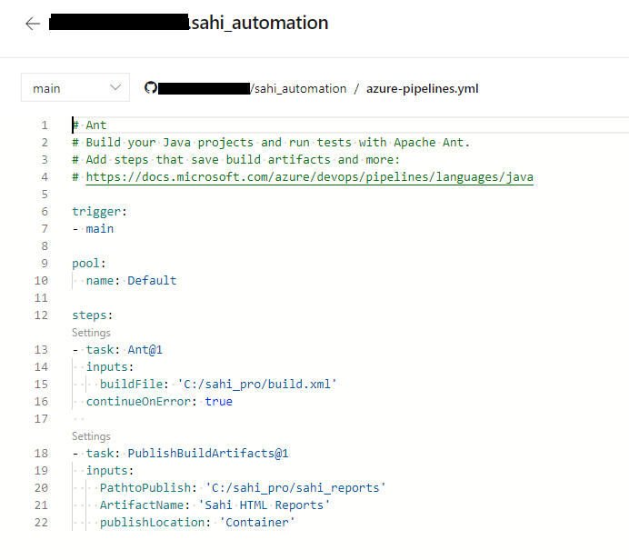 azure-pipelines.ymland copy the below content into it.# Ant # Build your Java projects and run tests with Apache Ant. # Add steps that save build artifacts and more: # https://docs.microsoft.com/azure/devops/pipelines/languages/java trigger: - main pool: name: Default steps: - task: Ant@1 inputs: buildFile: 'C:/sahi_pro/build.xml' continueOnError: true - task: PublishBuildArtifacts@1 inputs: PathtoPublish: 'C:/sahi_pro/sahi_reports' ArtifactName: 'Sahi HTML Reports' publishLocation: 'Container'