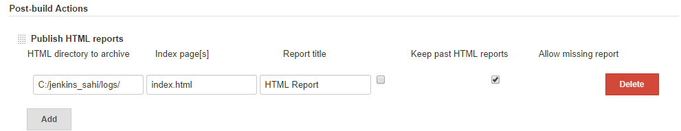 Add Post Build Actionbutton and selectPublish HTML Reports.infoNote: You need to install HTML Publisher plugin for this step. To learn more, use this linkProvide Logs directory and other details.