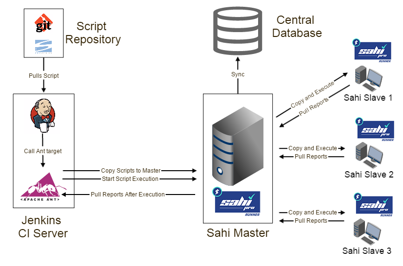 Jenkins pulls the latest scripts from the Source Control Management (SCM) system. It calls the Sahi ant target. Sahi target copies over the scripts from Jenkins (J) to master (SM). SM then copies scripts to SL1, SL2, SL3, distributes the execution and collects all reports. Sahi ant target then pulls reports from SM to Jenkins. This allows Jenkins to remain a headless server and does not need Sahi installed on it. Also all distribution of scripts and pulling of reports happens through Sahi's ant target itself.