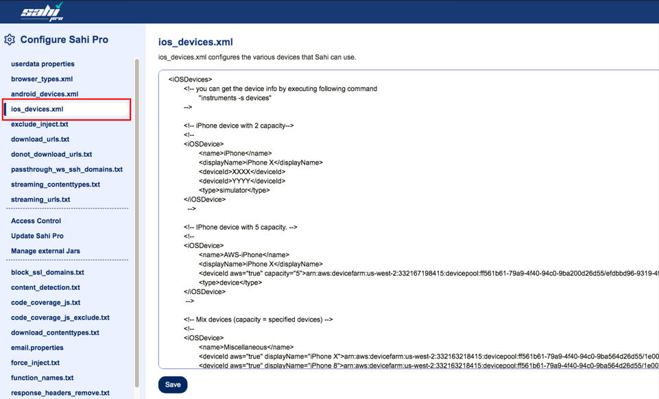 ios_devices.xml on the left. It will open up Configure Sahi Pro page.
