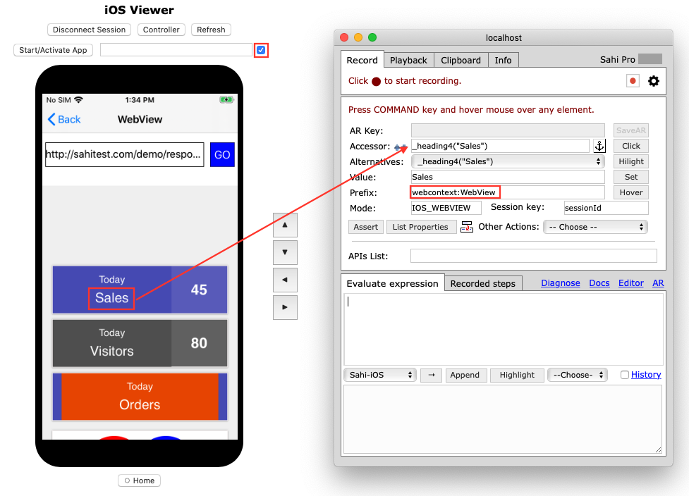 _setMode("IOS"); _mActivateApplication("com.sahipro.ios.test.SahiTestApp", true); _setAccessorIgnoreCase(true); _click(_button("Test Web View")); _setValue(_textbox("webViewTextFieldID"), "http://sahitest.com/demo/responsiveTestPage.htm"); _click(_button("GO")); // _mStartWebContext will change the mode to IOS_WEBVIEW _mStartWebContext(); _click(_heading4("Sales")); // _mStopWebContext will revert back the mode to IOS _mStopWebContext();