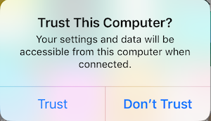 info This process does not required for testing iOS Simulator. - When the device is connected to the Mac for the first time, the user will get an alert on the device asking to