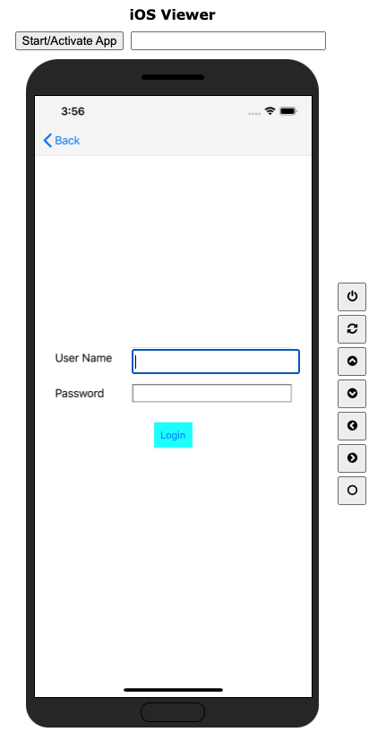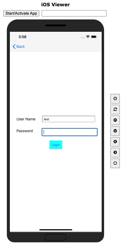 TEST SAMPLE APPLICATIONin the iOS Viewer. TheTEST SAMPLE APPLICATIONelement will be clicked on the device, and the Viewer screenshot will be refreshed. The Login screen is now visible.