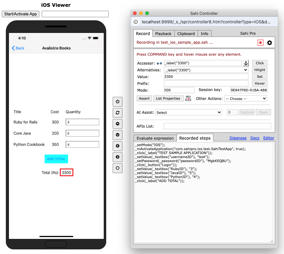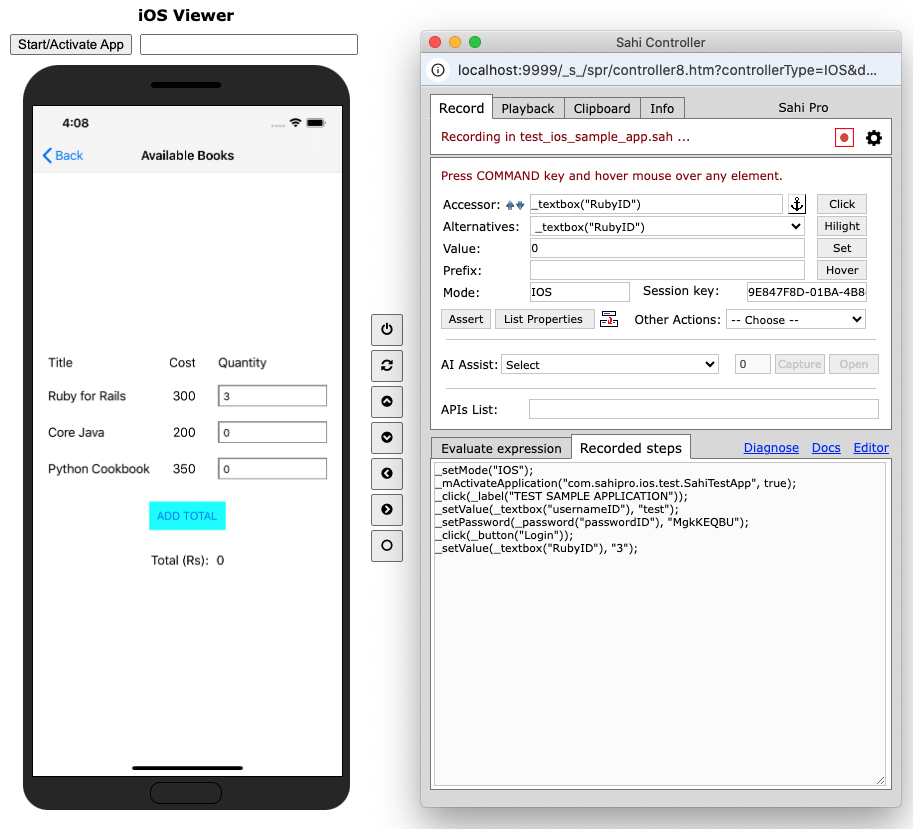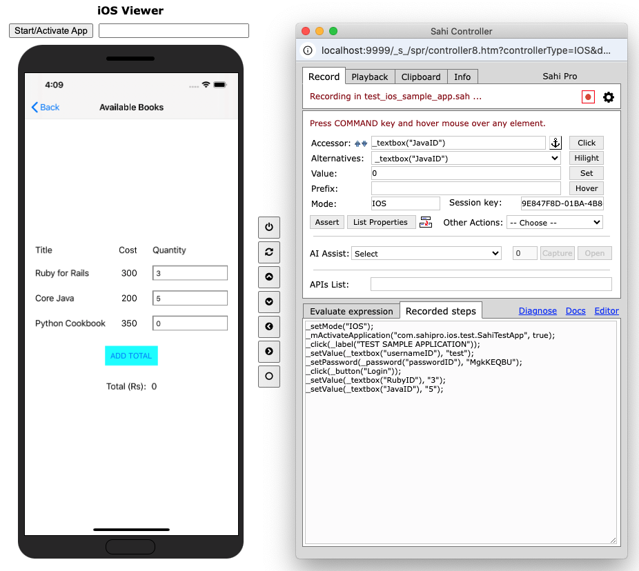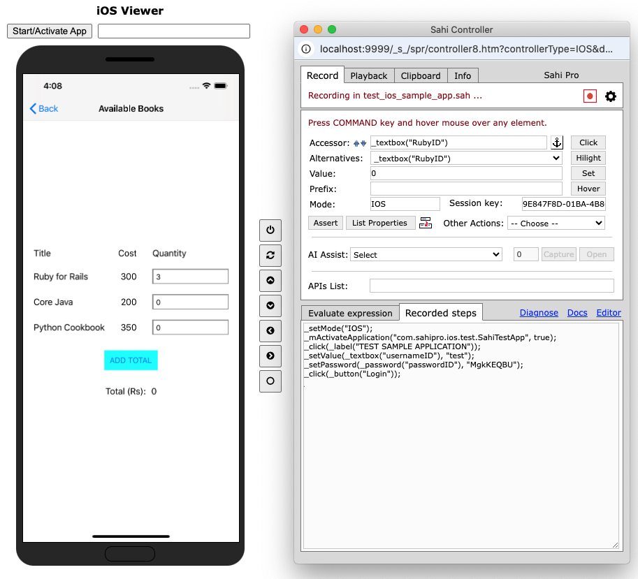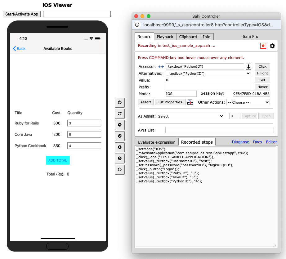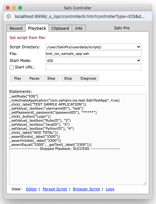 Editorfrom controller. The script looks like this._setMode("IOS"); _mActivateApplication("com.sahipro.ios.test.SahiTestApp", true); _click(_label("TEST SAMPLE APPLICATION")); _setValue(_textbox("usernameID"), "test"); _setPassword(_password("passwordID"), "MgkKEQBU"); _click(_button("Login")); _setValue(_textbox("RubyID"), "3"); _setValue(_textbox("JavaID"), "5"); _setValue(_textbox("PythonID"), "4"); _click(_button("ADD TOTAL")); _assertExists(_label("TotalCost")); _assertVisible(_label("TotalCost")); _assertEqual("3300", _getText(_label("TotalCost"))); - It is time to playback the script. Click on
