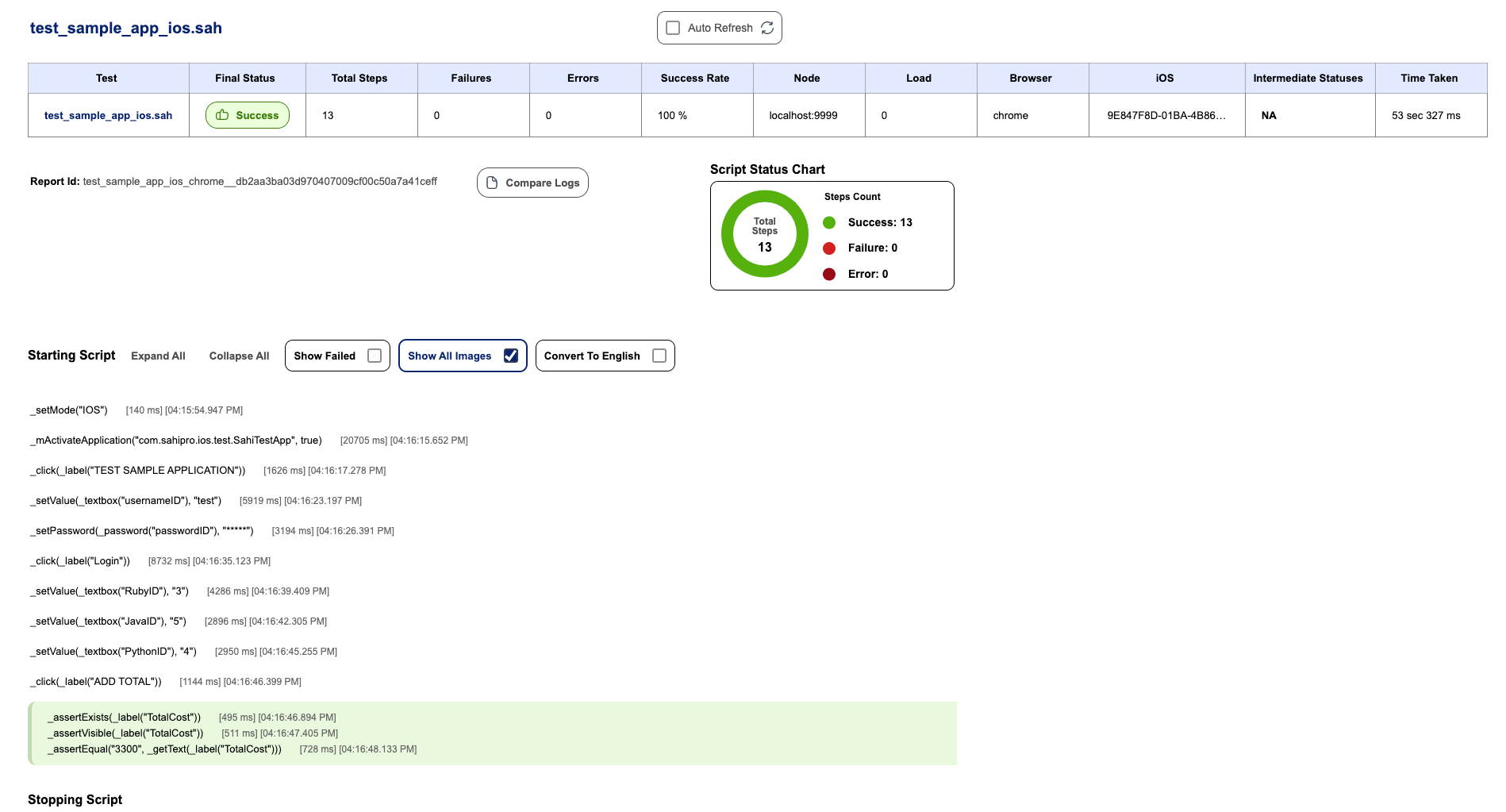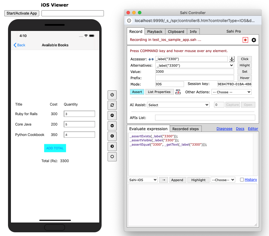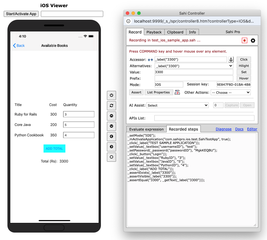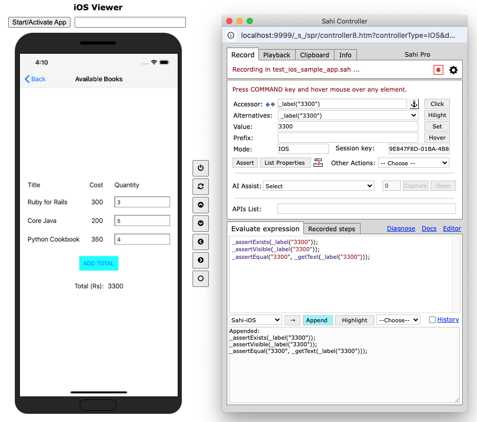 Editorfrom controller. The script looks like this._setMode("IOS"); _mActivateApplication("com.sahipro.ios.test.SahiTestApp", true); _click(_label("TEST SAMPLE APPLICATION")); _setValue(_textbox("usernameID"), "test"); _setPassword(_password("passwordID"), "MgkKEQBU"); _click(_button("Login")); _setValue(_textbox("RubyID"), "3"); _setValue(_textbox("JavaID"), "5"); _setValue(_textbox("PythonID"), "4"); _click(_button("ADD TOTAL")); _assertExists(_label("TotalCost")); _assertVisible(_label("TotalCost")); _assertEqual("3300", _getText(_label("TotalCost"))); - It is time to playback the script. Click on
